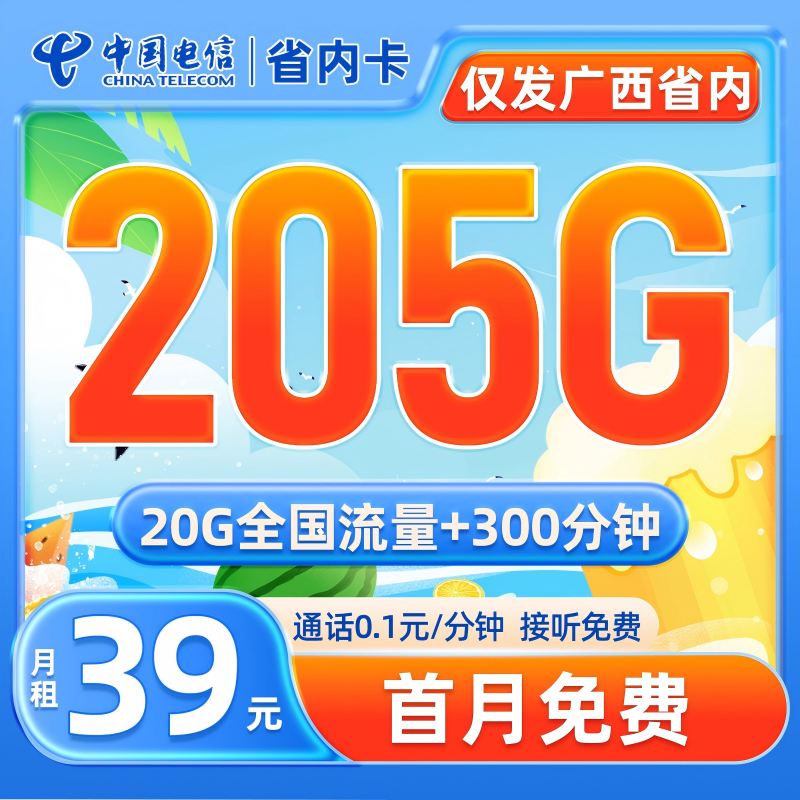 39元205G全国流量+300分钟通话(首月免费50G按天,30天后205G流量)